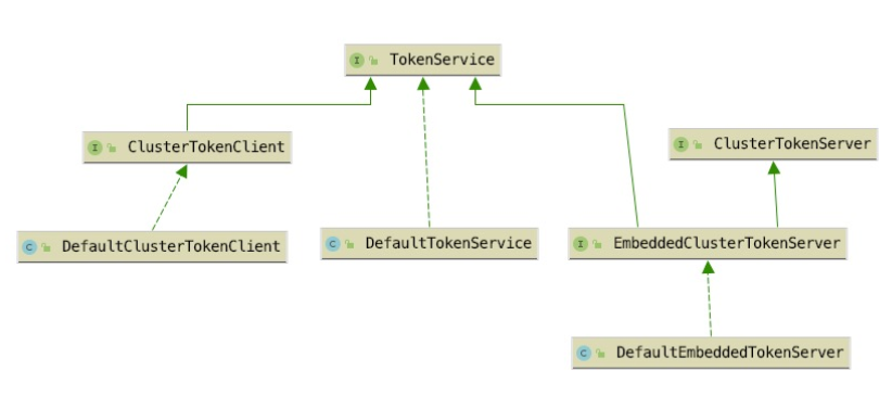 在上图中DefaultClusterTokenClient是 sentinel-cluster-client-default 模块中的 ClusterTokenClient 接口实现类,DefaultTokenService 与 DefaultEmbeddedTokenServer 分别是 sentinel-cluster-server-default 模块中的 ClusterTokenServer 接口与 EmbeddedClusterTokenServer 接口的实现类。
