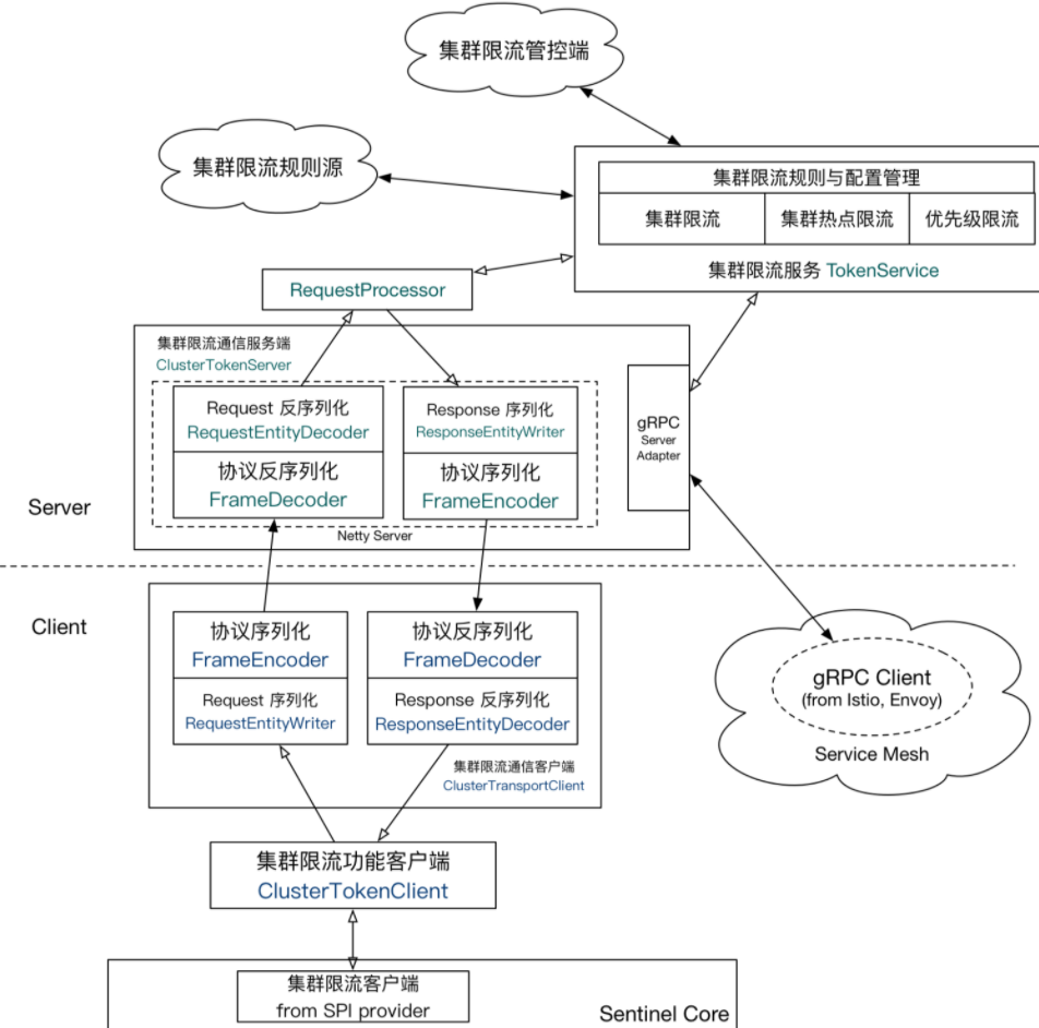 - ClusterTokenServer:集群限流服务端需要实现的接口